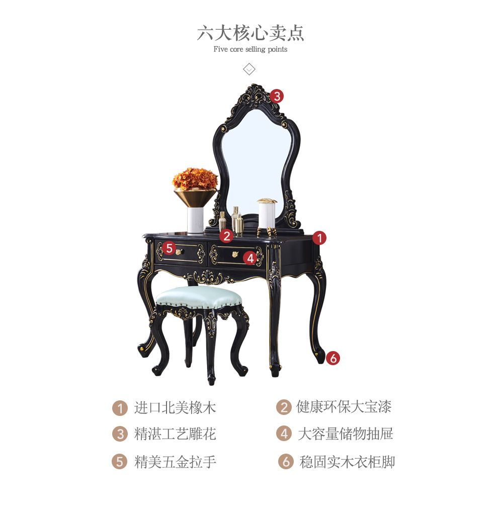 | 商品名称 | 夢の米の斯宣の化粧台の欧式の化粧台の腰掛けの小さい戸形の寝室の組合せのスーツの古典の木の貯蔵棚の化粧鏡の彫刻するオークのぼうっとしている化粧台の8610 1メートルの化粧台+化粧する腰掛け |