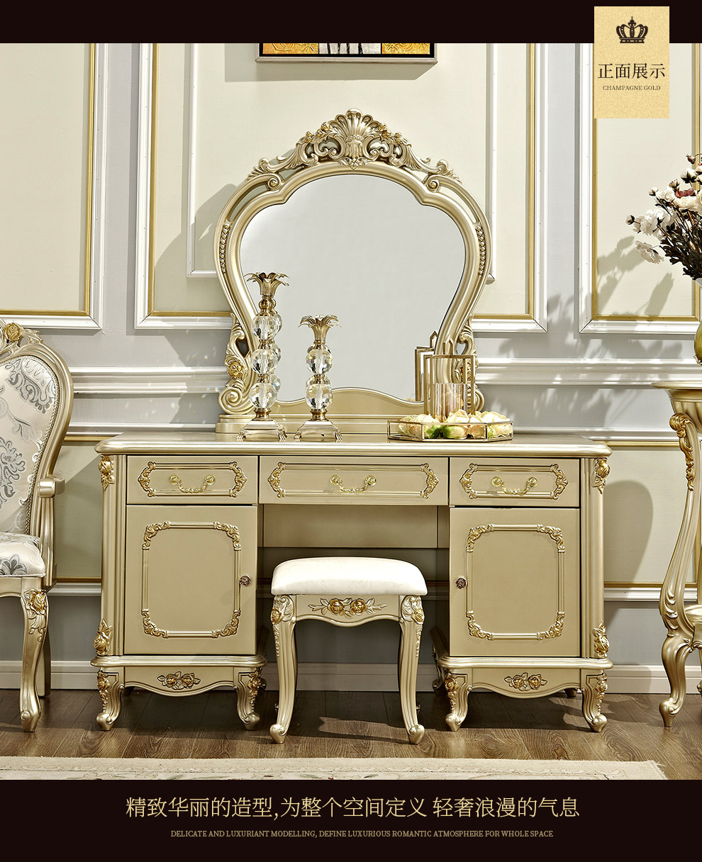 夢の美斯宣の化粧台の欧式の豪華なシャンパンの金の化粧台の軽奢な彫刻の化粧台は物の寝室の家具A 16化粧台+化粧する腰掛けを貯蓄することができます。