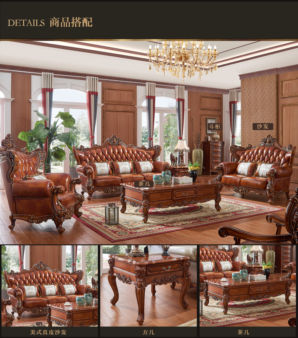 夢の美斯宣ソファ全実木欧風彫刻ソファセット牛の本革ソファ豪華クラウン新古典的な大型客間ソファ家具998 1+2+3セット